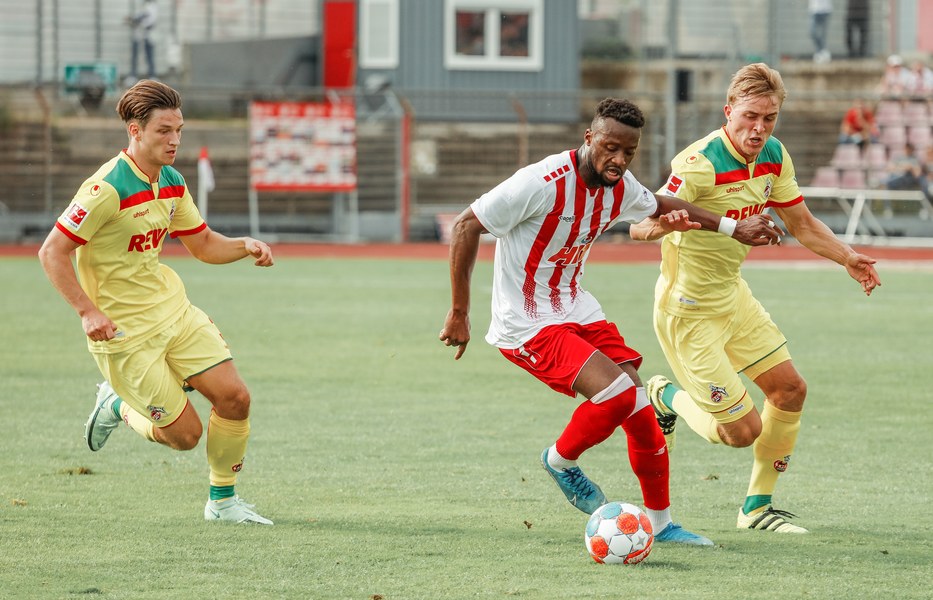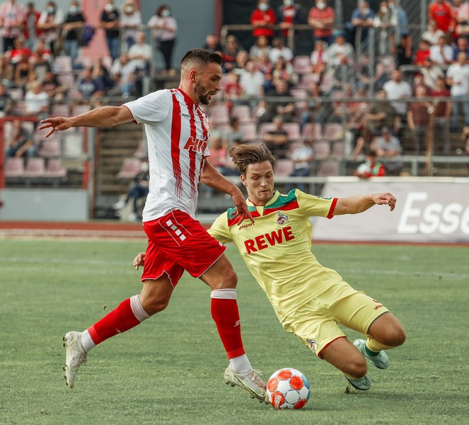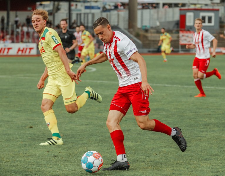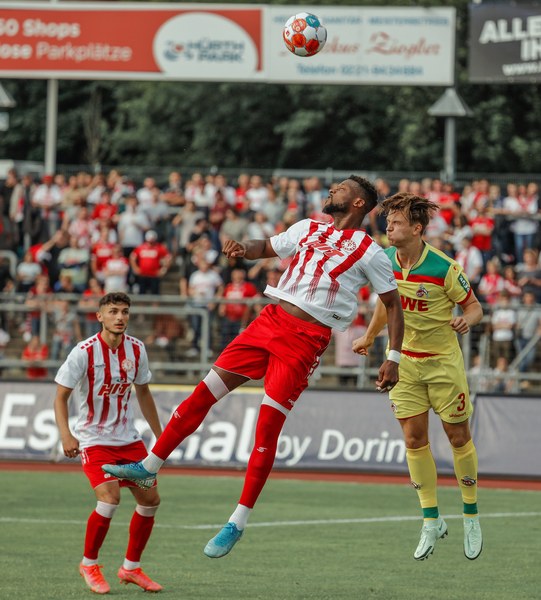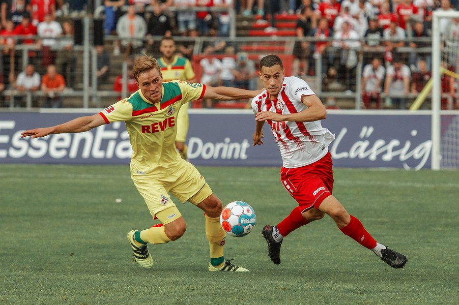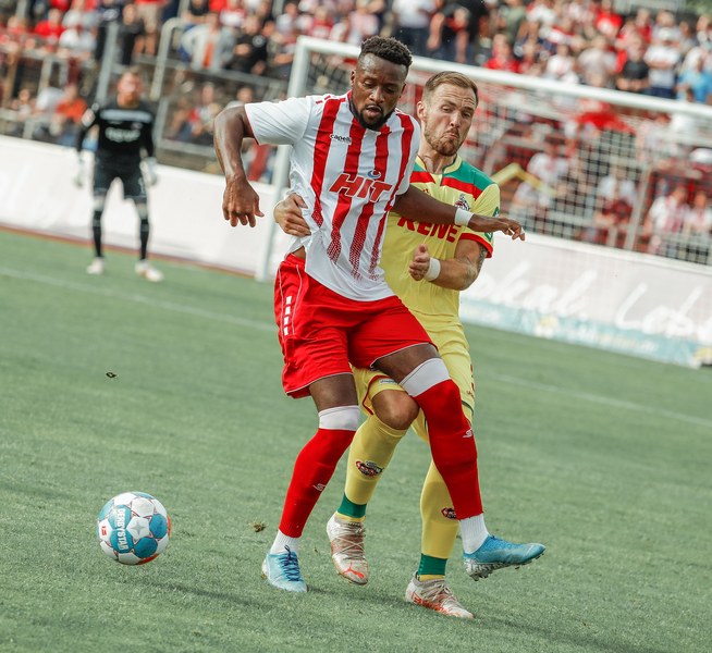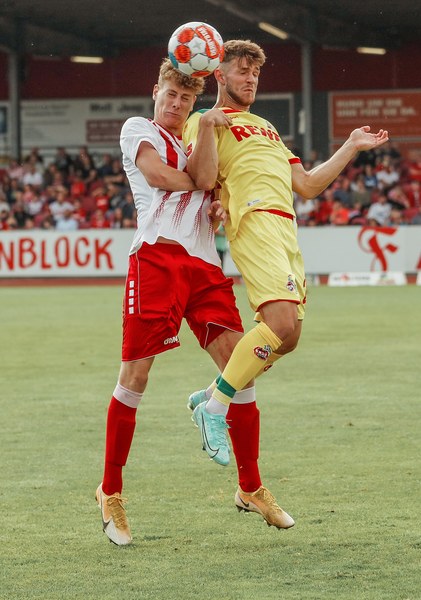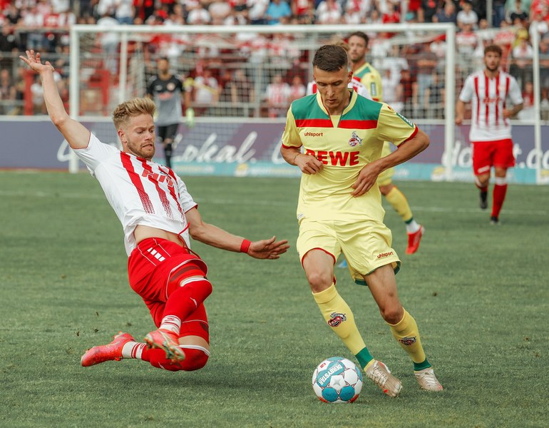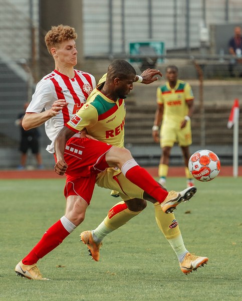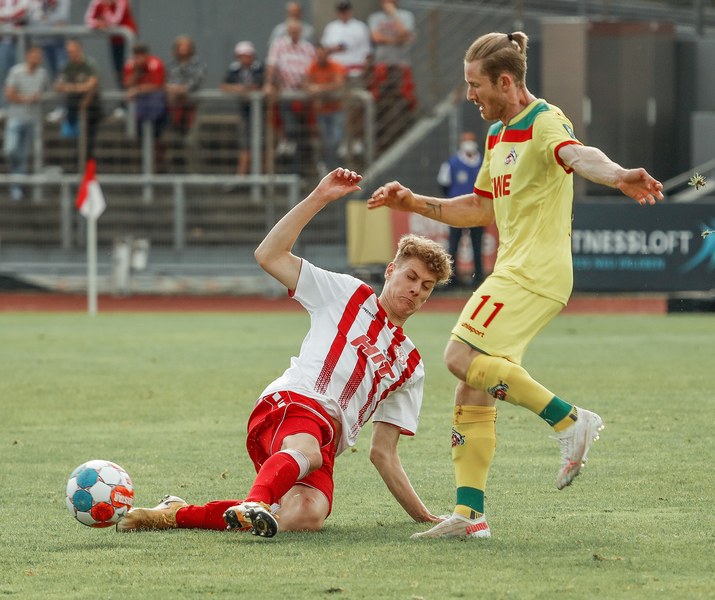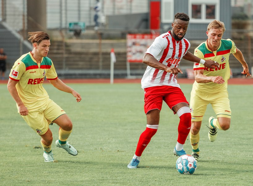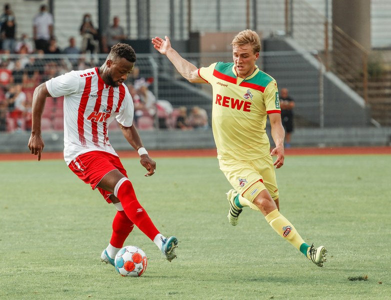 Der Bundesligist startete in seinem ersten Spiel unter Neu-Trainer Steffen Baumgart, von Beginn an sehr hoch, mit dem Ziel die Südstädter früh zu stören. Dies gelang Ihnen besonders in den Anfangsminuten, wo sie Mittelfeldmann Stipe Batarilo an der Sechzehnergrenze zum Ballverlust zwangen, jedoch nicht mehr aus der Aktion herausholten (5.). Den Jungs von Alexander Ende sah man die drei Klassen Unterschied jedoch vor allem in puncto Zweikampfführung und Einsatzfreude nicht an. Die Südstädter spielten mutig nach vorne und setzten die Gäste ebenfalls bei der Ballannahme unter Druck, was das ein oder andere Mal zur Folge hatte, dass der FC im eigenen Spielaufbau den Ball verlor, wie in der 7. Minute als Mike Owusu Kingsley Ehizibue in Mitte der Kölner Hälfte zu einem schwachen Abspiel zwang, welches jedoch von den Gästen bereinigt werden konnte. In der 10. Minute kamen die Hausherren erstmals zum Abschluss. Dimitris Limnios war beim hohen Anspiel von Timo Horn nicht aufmerksam genug und Sören Dieckmann störte ihn bei der Ballannahme. Dieckmann spielte den Ball auf Owusu, der den mit dem Rücken zum Tor stehenden Imbongo sah, welcher aus der Drehbewegung auf Sechzehner Höhe zum Schuss kam, den Gästekeeper Timo Horn vor keine größere Herausforderung stellte. Nach 17 gespielten Minuten brachte Owusu Ehizibue auf der halb linken Seite zu Fall. Den fälligen Freistoß spielten die Kölner schnell aus und brachten ihn Flach in den Strafraum, wo Stürmer Anthony Modeste den Ball an den linken Pfosten bugsierte. Die Situation wurde daraufhin allerdings wegen einer Abseitsstellung abgepfiffen. Etwas neben dem Spielgeschehen lag Timo Hölscher am Boden, der nach einem Zweikampf wohl etwas abbekommen hat und für den es nicht mehr weiterging. So kam Gastspieler Dej zu seinem Einsatz. Das frühe Pressing der Gäste birgte auch Risiken für die Hintermannschaft. Nach einem Stockfehler von Innenverteidiger Rafael Czichos nahm Neuzugang Dimitry Imbongo zunächst Fahrt auf und hätte Kontern können, jedoch waren seine Aussichten auf Erfolg im 1 gegen 2 nur semi erfolgreich, weshalb er sich entschloss den Konter abzubrechen (21.). Balleroberungen wie diese zeigten aber durchaus, dass die Fortuna gewillt ist mitzuspielen und sich keineswegs nur hinten reindrängen ließ. So entstand auch die Beste Chance der Fortuna in der 34. Minute. Je länger das Spiel lief, umso mehr traute sich die Fortuna zu und war des öfteren in der Hälfte der Geißböcke präsent. Imbongo eroberte auf Höhe der Mittellinie den Ball und startete durch in Richtung Gäste Tor und steckte den Ball durch auf den ihn überlaufenden Owusu, welcher in den Sechzehner eindrang. Owusu legte quer in den Fünfmeterraum, wo zunächst der einlaufende Leon Demaj und anschließend Batuhan Özden nur knapp verpasste. Dort hätte die Fortuna gegen den Bundesligisten in Führung gehen können. Doch es kam wie es auf dem Papier zu erwarten war. Der Bundesligist ging in der 36. Spielminute durch Jan Thielmann in Führung. Einen Fehlpass im Spielaufbau nutzte der FC eiskalt aus und traf nicht unverdient zur Führung der Gäste. Mit diesem Spielstand ging es schlussendlich auch in die Halbzeitpause. Dort waren dann die beiden Club Präsidenten Dr. Werner Wolf und Hanns-Jörg Westendorf zu Gast im Halbzeitinterview auf sporttotal.tv, wo die beiden durchblicken ließen, dass es zu diesem Spiel nun häufiger in den folgenden Saisonvorbereitungen kommen könnte.