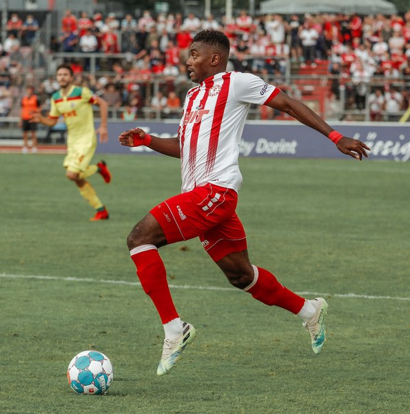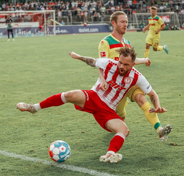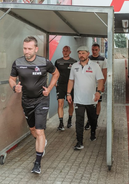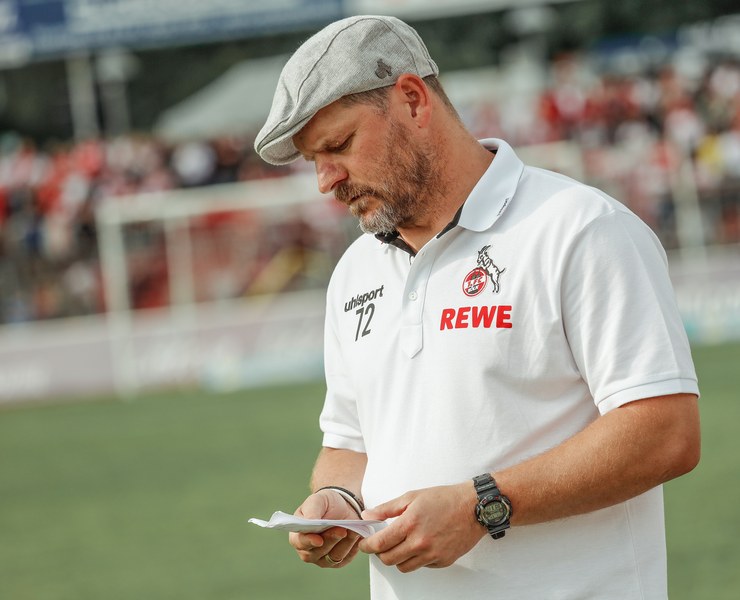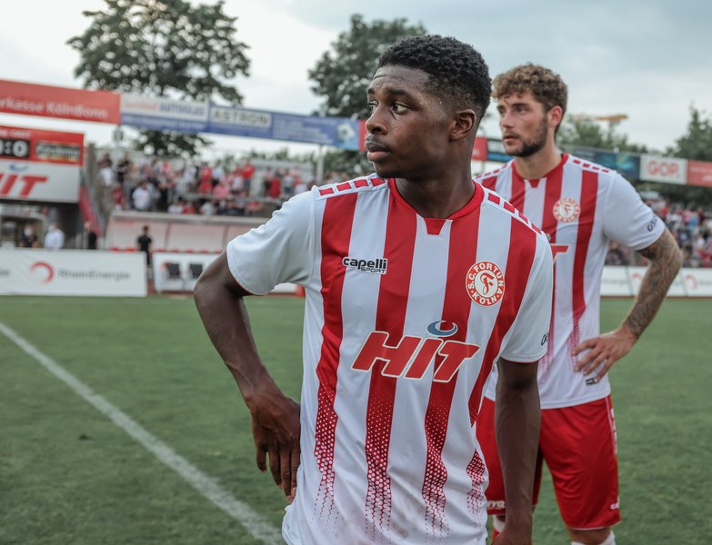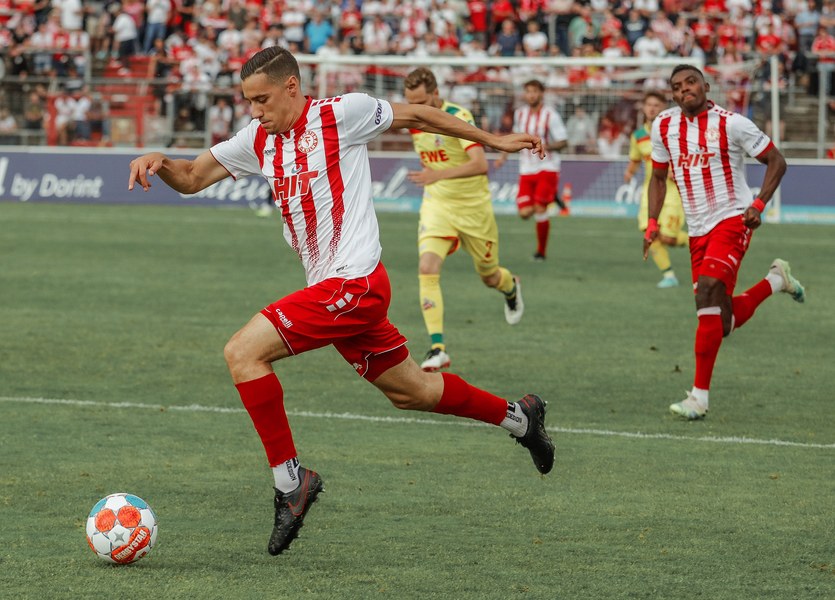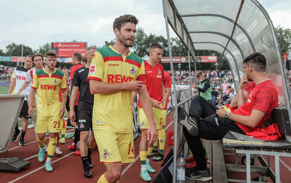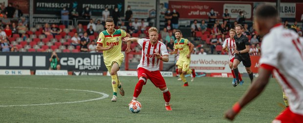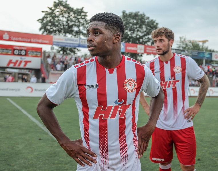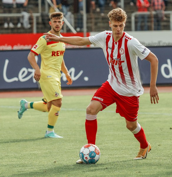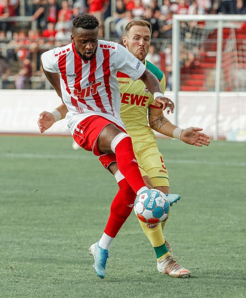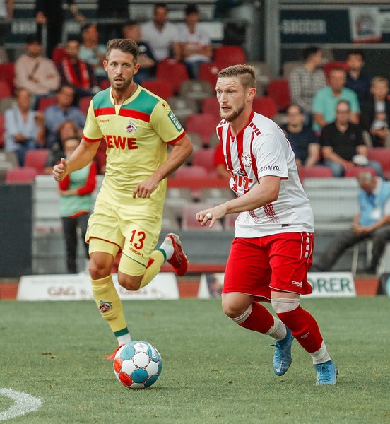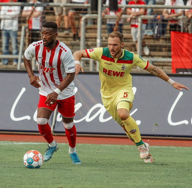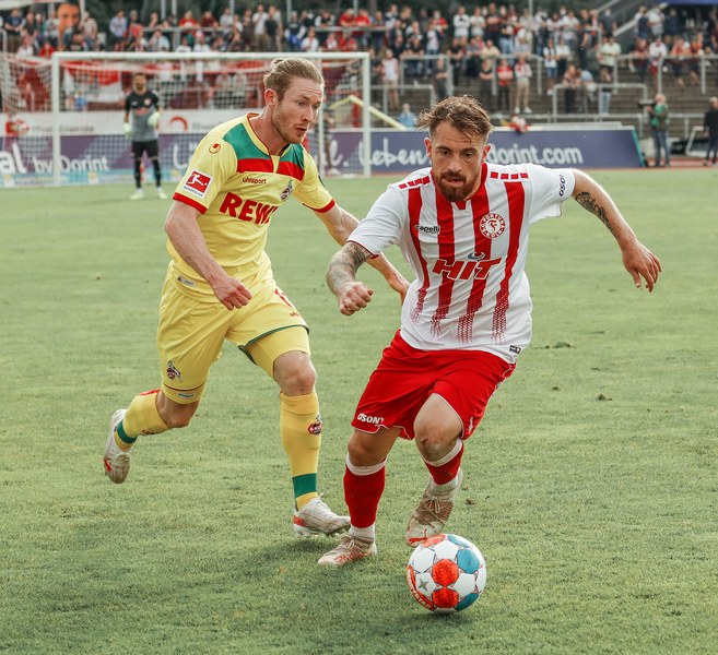 Der Bundesligist startete in seinem ersten Spiel unter Neu-Trainer Steffen Baumgart, von Beginn an sehr hoch, mit dem Ziel die Südstädter früh zu stören. Dies gelang Ihnen besonders in den Anfangsminuten, wo sie Mittelfeldmann Stipe Batarilo an der Sechzehnergrenze zum Ballverlust zwangen, jedoch nicht mehr aus der Aktion herausholten (5.). Den Jungs von Alexander Ende sah man die drei Klassen Unterschied jedoch vor allem in puncto Zweikampfführung und Einsatzfreude nicht an. Die Südstädter spielten mutig nach vorne und setzten die Gäste ebenfalls bei der Ballannahme unter Druck, was das ein oder andere Mal zur Folge hatte, dass der FC im eigenen Spielaufbau den Ball verlor, wie in der 7. Minute als Mike Owusu Kingsley Ehizibue in Mitte der Kölner Hälfte zu einem schwachen Abspiel zwang, welches jedoch von den Gästen bereinigt werden konnte. In der 10. Minute kamen die Hausherren erstmals zum Abschluss. Dimitris Limnios war beim hohen Anspiel von Timo Horn nicht aufmerksam genug und Sören Dieckmann störte ihn bei der Ballannahme. Dieckmann spielte den Ball auf Owusu, der den mit dem Rücken zum Tor stehenden Imbongo sah, welcher aus der Drehbewegung auf Sechzehner Höhe zum Schuss kam, den Gästekeeper Timo Horn vor keine größere Herausforderung stellte. Nach 17 gespielten Minuten brachte Owusu Ehizibue auf der halb linken Seite zu Fall. Den fälligen Freistoß spielten die Kölner schnell aus und brachten ihn Flach in den Strafraum, wo Stürmer Anthony Modeste den Ball an den linken Pfosten bugsierte. Die Situation wurde daraufhin allerdings wegen einer Abseitsstellung abgepfiffen. Etwas neben dem Spielgeschehen lag Timo Hölscher am Boden, der nach einem Zweikampf wohl etwas abbekommen hat und für den es nicht mehr weiterging. So kam Gastspieler Dej zu seinem Einsatz. Das frühe Pressing der Gäste birgte auch Risiken für die Hintermannschaft. Nach einem Stockfehler von Innenverteidiger Rafael Czichos nahm Neuzugang Dimitry Imbongo zunächst Fahrt auf und hätte Kontern können, jedoch waren seine Aussichten auf Erfolg im 1 gegen 2 nur semi erfolgreich, weshalb er sich entschloss den Konter abzubrechen (21.). Balleroberungen wie diese zeigten aber durchaus, dass die Fortuna gewillt ist mitzuspielen und sich keineswegs nur hinten reindrängen ließ. So entstand auch die Beste Chance der Fortuna in der 34. Minute. Je länger das Spiel lief, umso mehr traute sich die Fortuna zu und war des öfteren in der Hälfte der Geißböcke präsent. Imbongo eroberte auf Höhe der Mittellinie den Ball und startete durch in Richtung Gäste Tor und steckte den Ball durch auf den ihn überlaufenden Owusu, welcher in den Sechzehner eindrang. Owusu legte quer in den Fünfmeterraum, wo zunächst der einlaufende Leon Demaj und anschließend Batuhan Özden nur knapp verpasste. Dort hätte die Fortuna gegen den Bundesligisten in Führung gehen können. Doch es kam wie es auf dem Papier zu erwarten war. Der Bundesligist ging in der 36. Spielminute durch Jan Thielmann in Führung. Einen Fehlpass im Spielaufbau nutzte der FC eiskalt aus und traf nicht unverdient zur Führung der Gäste. Mit diesem Spielstand ging es schlussendlich auch in die Halbzeitpause. Dort waren dann die beiden Club Präsidenten Dr. Werner Wolf und Hanns-Jörg Westendorf zu Gast im Halbzeitinterview auf sporttotal.tv, wo die beiden durchblicken ließen, dass es zu diesem Spiel nun häufiger in den folgenden Saisonvorbereitungen kommen könnte.