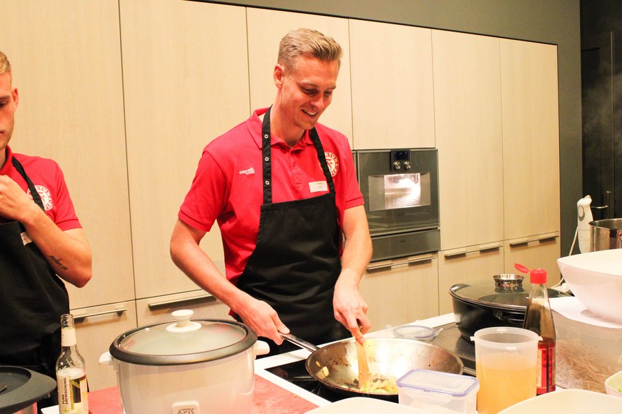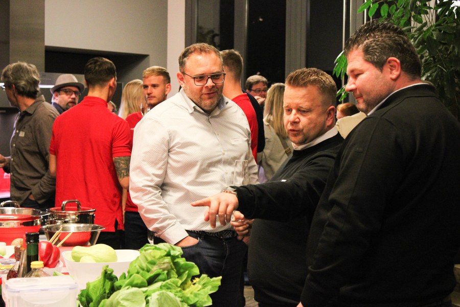 Dabei wurden die Partner der Fortuna in drei Gruppen eingeteilt. Die erste Gruppe kümmerte sich gemeinsam mit und um Gruppenkopf Lars Bender um die Vorspeise. Angerichtet in kleinen Tassen, genossen die Gäste eine Steinpilzsuppe. Seinen Höhepunkt fand der Abend mit dem Hauptgericht, für den Kevin Rauhut mit seiner Gruppe zuständig war. Für einen gelungenen Abschluss sorgten schließlich die Köche der Nachspeise, die von Jannes Hoffmann angeführt wurden.