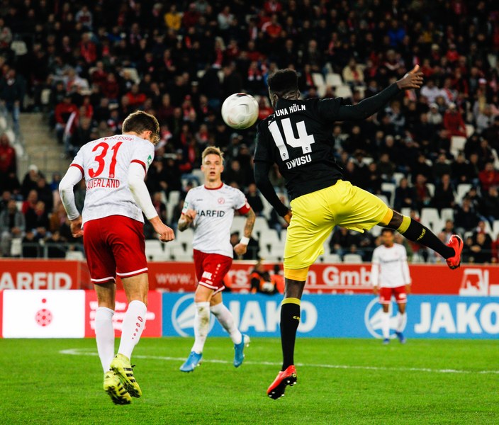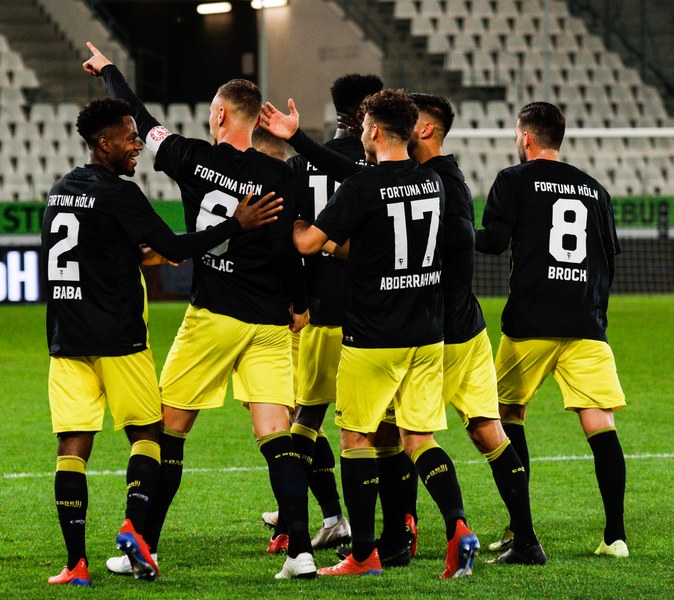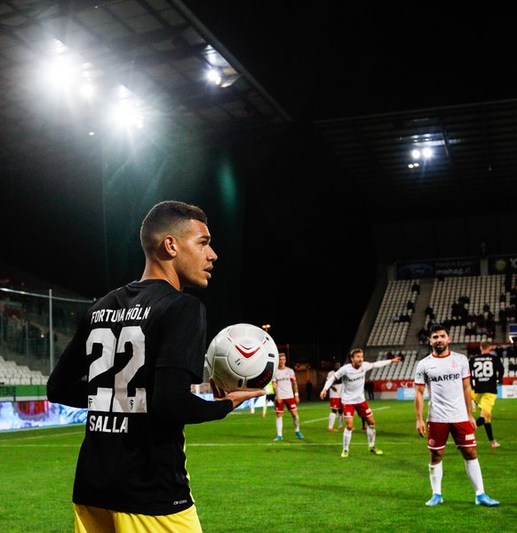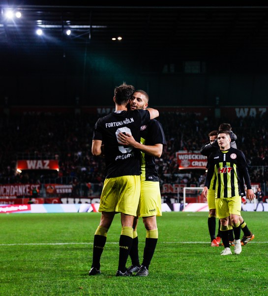 Beide Mannschaften kamen mit ordentlich Tempo aus der Kabine. Doch es war gerade einmal eine Minute gespielt, ehe sich Fortuna selbst in Bedrängnis brachte. Franko Uzelac spielte einen riskanten Rückpass auf Kevin Rauhut. Der Kölner Keeper war gerade noch vor dem heranrauschenden Selishta am Ball. Auch in der nächsten Szene stand der Fortuna Kapitän im Mittelpunkt, diesmal jedoch als Anstoß eines Fortuna-Angriffs. Mit seinem langen Ball fand er Lionel Salla, der die linke Seite langmarschierte und kurz vor der Grundlinie zurücklegte. Über Umwege landete der Ball bei Dennis Brock und schließlich Mike Owusu, der mit seinem Abschluss das Tor jedoch klar verfehlte (4.). Auf der anderen Seite kombinierte sich Essen bis zum Strafraum durch, ehe der Ball bei Endres landete. Der Essener versuchte es mit einem Schlenzer auf in die lange Ecke, verfehlte das Tor aber knapp (8.). Kurze Zeit später landete der Ball dann doch im Fortuna Tor. Die erhobene Fahne des Linienrichters unterbrach jedoch den Jubel der Essener – Abseits. Jubel gab es dann aber schließlich auf der anderen Seite. Franko Uzelac zog einen Freistoß aus knapp 30 Metern direkt auf das Tor und versenkte den Ball flach in der linken unteren Ecke. Es machte sich Unmut breit im Stadion Essen und Fortuna versuchte, die Ungenauigkeiten des Gegners auszunutzen. So spritzten die Südstädter in einen Aufbau von RWE. Dadurch, dass RWE den Keeper bei den Angriffen zwischen die Innenverteidiger zog, war das Tor blank. Prokoph versuchte es mit dem Heber über den zurückeilenden Keeper, setzte aber zu hoch an und verfehlter das Tor (27.). Fortuna machte Druck, scheiterte aber gleich doppelt mit zwei großen Chancen. Erst traf Mike Owusu nur den Pfosten (35.), dann scheiterte Salman am Keeper (37.). So blieb es bei der knappen 1:0-Führung der Fortuna zur Pause.