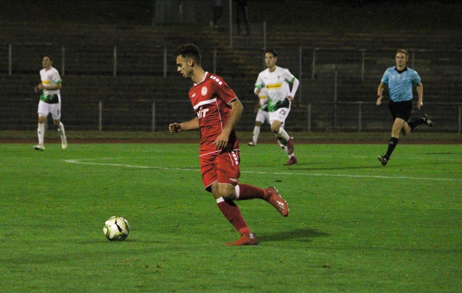 In den Anfangsminuten setzte die Borussia die ersten Akzente des Spiels. Nach Fehlpass von Försterling im Mittelfeld, zog Italiano Richtung Tor und suchte an der Strafraumkante den Abschluss. Kevin Rauhut lenkte den Ball sicher zur Ecke (3.). Nur eine Minute später hatte die Fortuna Glück, als ein abgefälschter Schuss knapp neben dem Kasten landete (4.). Bereits in den Anfangsminuten mussten die Kölner aufpassen, nicht in Rückstand zu geraten. Die Fortuna tauchte durch eine Ecke erstmals gefährlich vor dem Kasten von Max Grün auf. Den hereingeschlagenen Ball klärte Gladbach im ersten Versuch. Prokoph nutzte jedoch die zweite Welle, um den Ball vor das Tor zu köpfen, fand dort aber keinen Mitspieler (8.). Auf der anderen Seite versuchte es Cirillo mit einem Distanzschuss, der nur knapp am langen Pfosten vorbei ging (12.). Jubeln durfte zehn Minuten später dann aber die Fortuna. Nach starker Balleroberung im Mittelfeld machte sich Mike Owusu auf den Weg nach vorne und legte vor dem Kasten noch einmal quer auf Salman, der den Ball mit Hilfe eines Gladbacher Beins im Kasten versenkte (22.). Der Schrei nach dem Tor machte deutlich, wie wichtig dieser Treffer war. Es zeigte sich ein offenes Spiel, in dem die Fortuna mehr Kontrolle hatte, als noch zu Beginn der ersten Halbzeit. Gladbach versuchte es immer wieder aus der Distanz, fand seinen Meister aber oftmals in Kevin Rauhut, während Fortuna schnelle Konter nutzte, um für Akzente zu sorgen. So war es Alem Koljic, der über die rechte Offensivseite das Tempo anzog und an der Kante zum Strafraum flach vor das Tor spielte, wo Roman Prokoph im Hereinrutschen knapp verpasste (39.). So ging es mit der knappen Führung der Südstädter in die Pause.