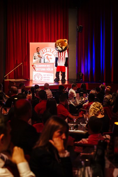 Ab 19 Uhr ging es in den Theatersaal, welcher von den Sponsoren und der gesamten Mannschaft der Fortuna um Trainer Alexander Ende vollständig besetzt wurde. Nach dem es gleich stets gute Gespräche an den Tischen gab eröffnete unser Geschäftsführer Benjamin Bruns die Veranstaltung und zog ein erstes Resumee zum 1/3 Drittel der Saison und lobte den sportlichen Bereich für das bisherige Abschneiden. Ein Highlight war sicherlich die Darstellung des kuriosen 1:0 der Fortuna in Oberhausen.