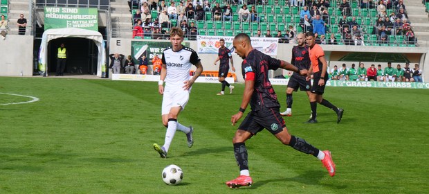 Von der ersten Minute an war die Fortuna tonangebend, presste den Gegner schon in der eigenen Hälfte und ließ die Hausherren nie zur Entfaltung kommen. Nach einer kurz ausgeführten Ecke von Jonas Michelbrink auf Rafael Garcia kam der Ball zu Adrian Stanilewicz. Dessen Flanke köpft David Al-Azzawe in Richtung Tor. Rödinghausens Torwart Dennis Gorka konnte den Ball nicht festmachen und Hamadi Al Ghaddioui staubte ab zum 0:1 (22.). Fünf Minuten vor der Pause schlich sich Garcia im Rücken von Viktor Miftaraj in den Strafraum, er eroberte den Ball und wäre alleine auf Gorka zugelaufen. Der Innenverteidiger zog die Notbremse und sah Rot. Den Strafstoß verwandelte Enzo Wirtz zum dritten Mal in dieser Spielzeit sicher zum 0:2.