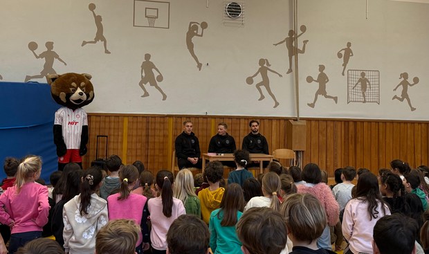 Im Anschluss versammelte sich die Schule, Kinder und Lehrkräfte, zur großen Fragerunde. Neugierig stellten die Schülerinnen und Schüler Fragen wie: „Wie viele Tore habt ihr schon geschossen?“, „Seid ihr mit euren Mitspielern befreundet?“ oder „Wer ist der beste Spieler bei euch?“. Die Spieler beantworteten alles offen und mit viel Humor. Zum Abschluss gab es eine Autogramm- und Fotostunde, bei der die Kinder Erinnerungsfotos mit Maskottchen Fred machen konnten, ein echtes Highlight für alle Beteiligten.